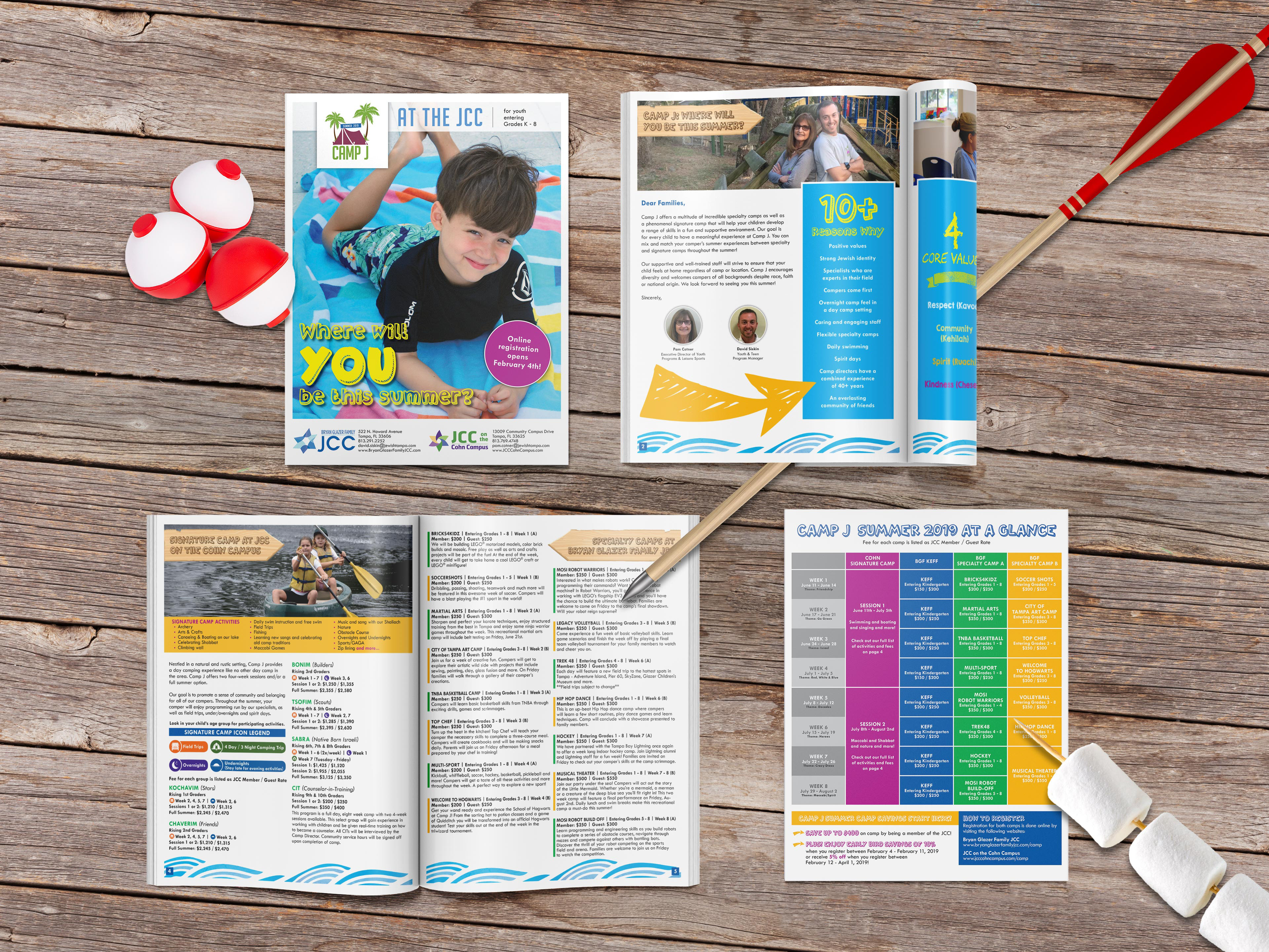 As part of a rebranding effort, Camp JCC was now becoming Camp J, which included a new logo and marketing materials. The brochure was a pivotal marketing piece as it was redesigned from the ground up to present the newly-branded summer camp in an informative, fun way for our younger demographic.